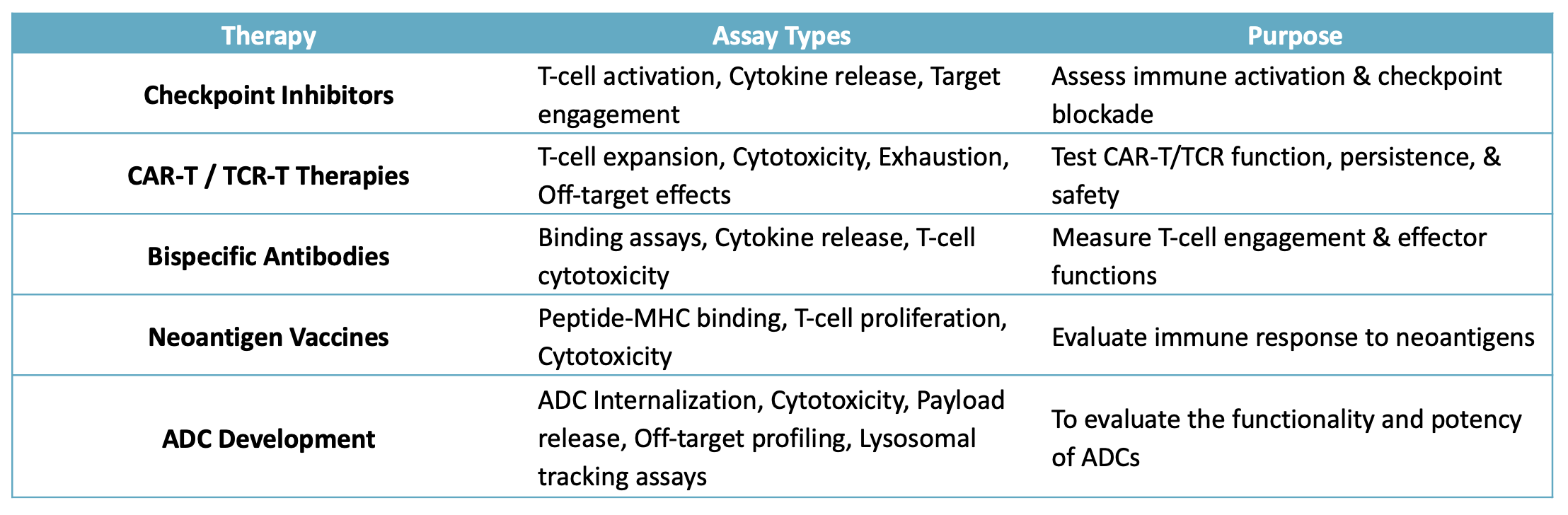 Summary Table of Key In Vitro Assays for Immunotherapies: