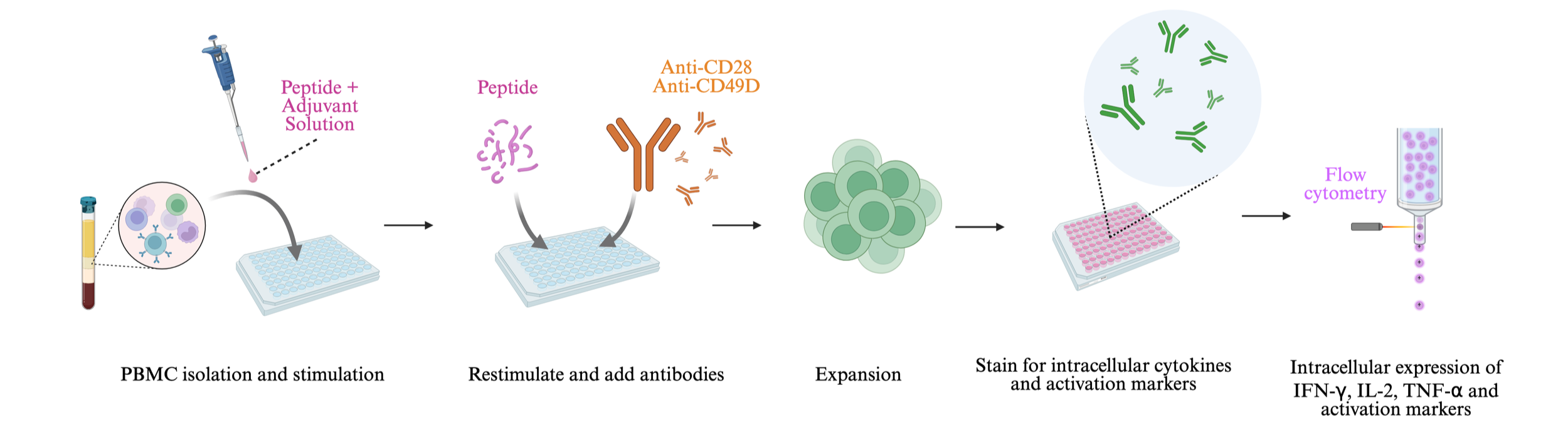Target cells (PBMCs) are stimulated with adjuvant solution containing peptides.